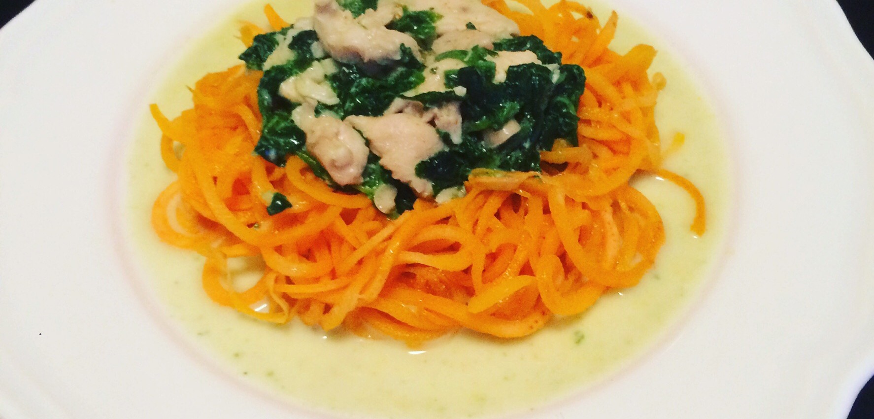 Dans une poêle faites cuire à feu moyen 1 cuillère à café d'huile de coco puis ajoutez les spaghettis de patates douces pendant 5 minutes en remuant. Salez, poivrez.